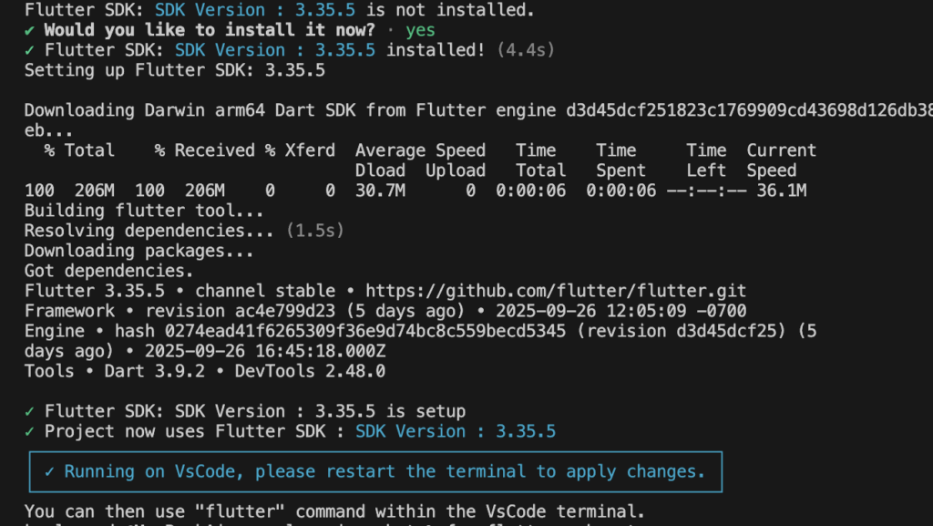• fvm use 3.35.5 は Flutter 3.35.5 を固定する指定。チーム全員で同じバージョンを使うならこの形式がおすすめ。